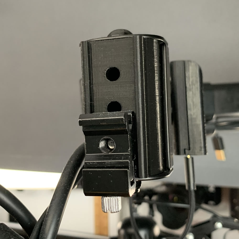 This very custom parts fits to my rigging gear and can hold 1-3 mounting options like a cold-shoe or sorts of. Is is very specific to my usecase, so it my be of great value to you until you have the same rigging arms. But I will offer it anyway for the one guy who is also using this. Cheers mate.