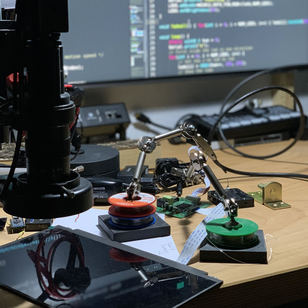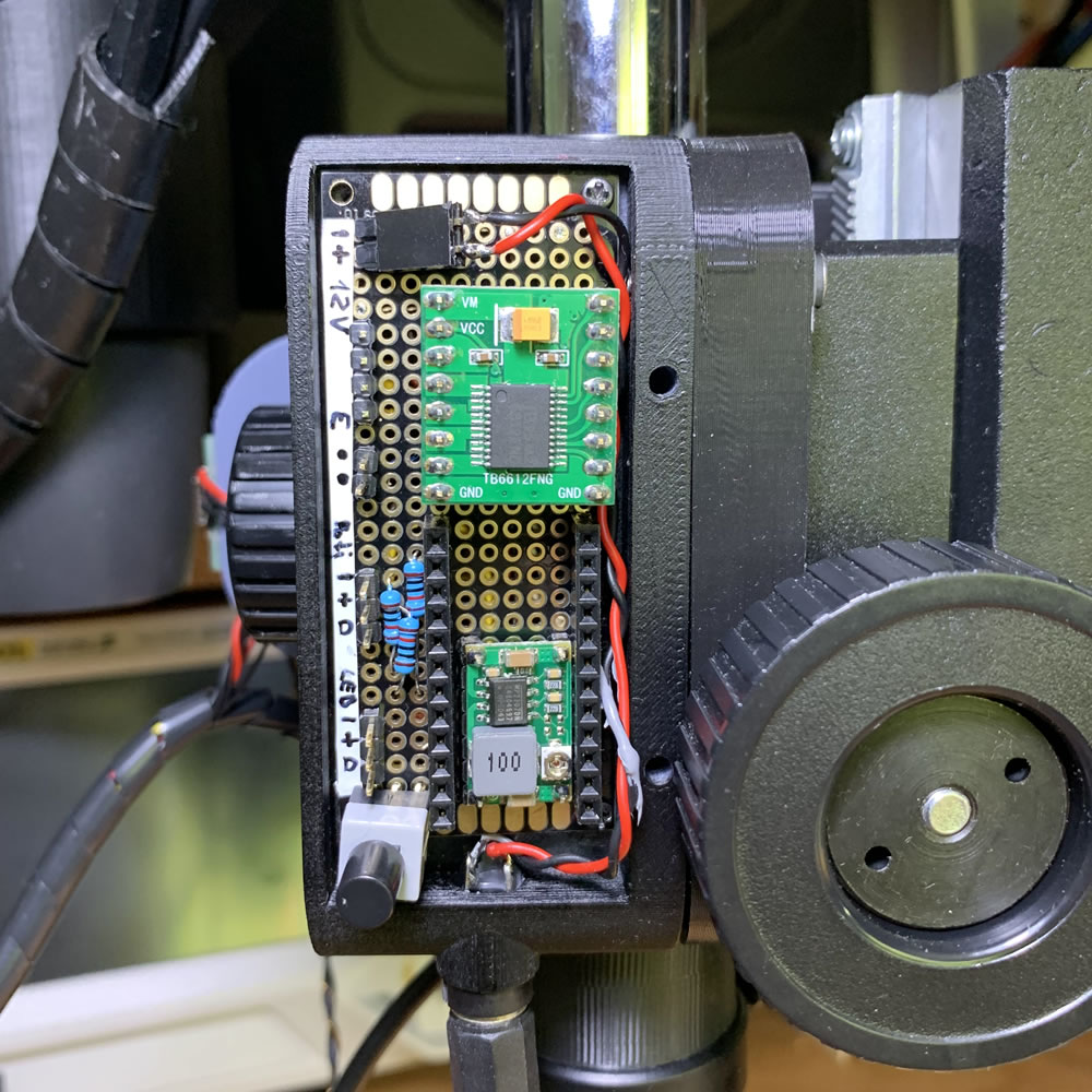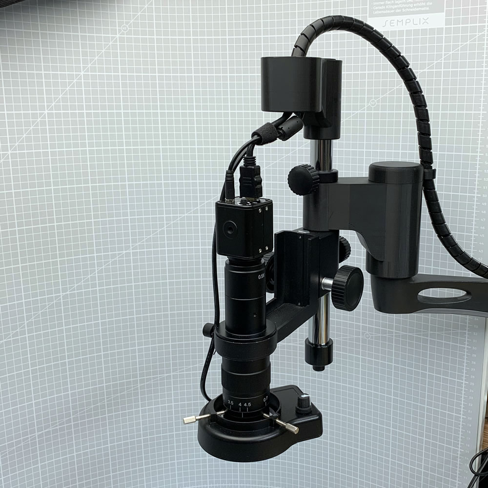 A Microscope can make a big difference when it comes to soldering, debugging or inspecting in general. Yet, it was always out of my price range. Over the years I gathered parts separately and build myself one that way. It had some drawbacks. One was the hand-controlled focus wheel. As soon as you touch your microscope, you are greeted with a shaking image. I wondered if I could just drive the focus-wheel by a motor in the slow stepped manner, without any shakes to the images. In this first prototype I came to a solution that I am still using. I designed it in a way, that I could easily switch between motor controlled focus and hand controlled by decoupling the gears on the fly. I went through several iterations until I found a motor and a reduction gear, that works for the microscope but found a solutions that worked for me.