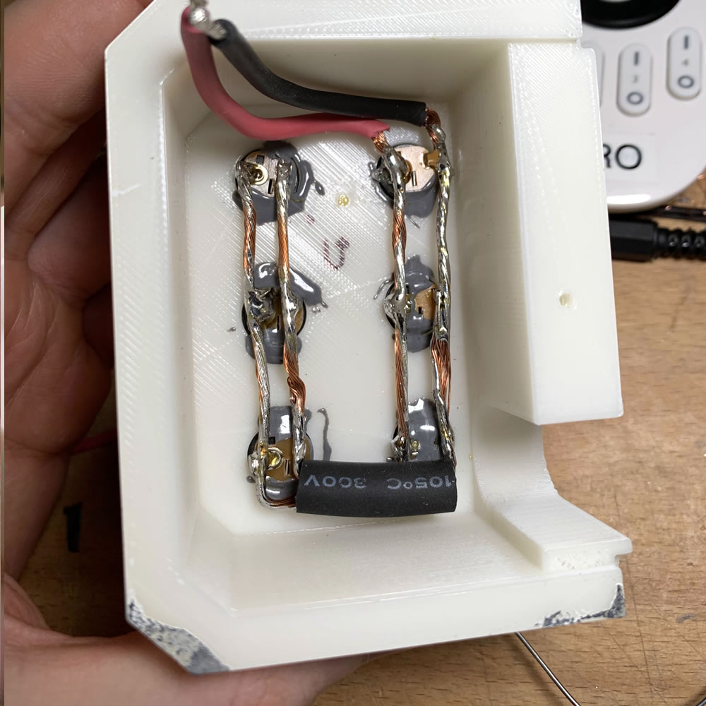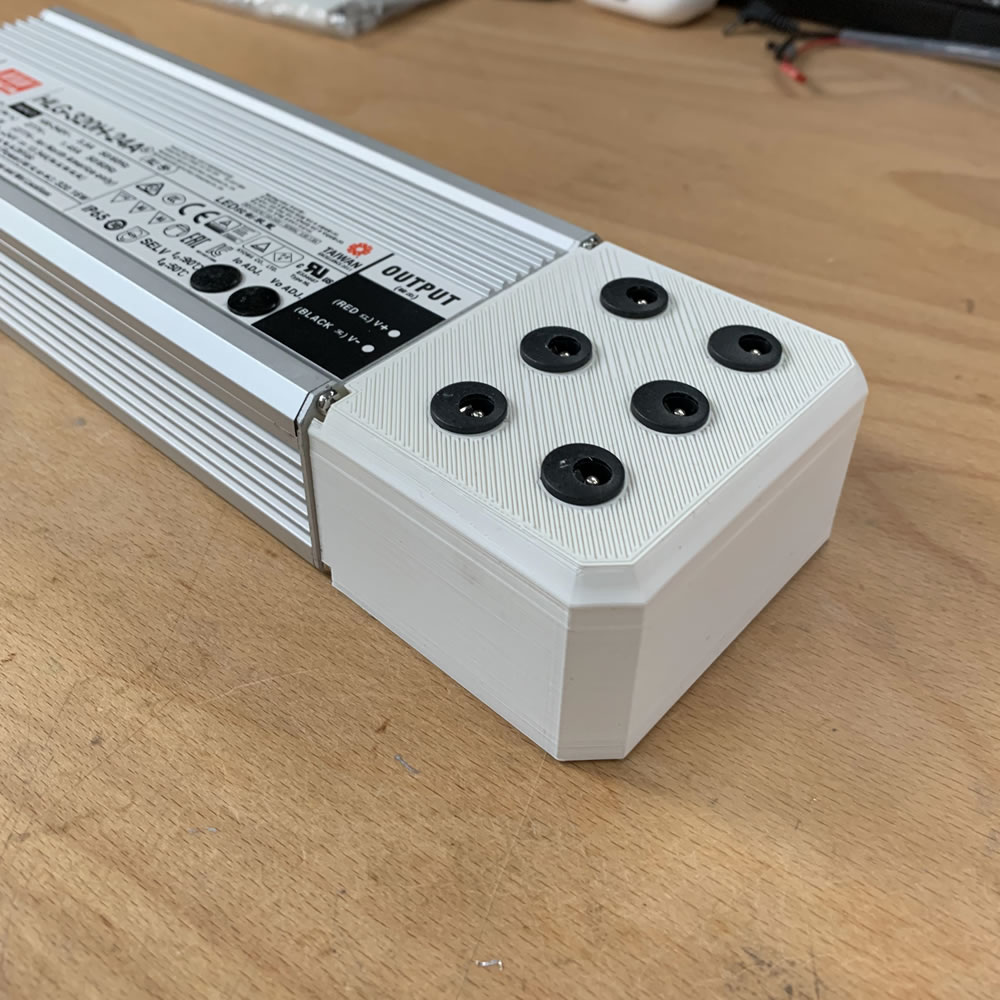 Now that I had all these parts, I applied them to various forms of outlets. Some of them can be found in my catalog. They range from obscure to nifty solutions. This one right here, is more of a elegant solution, as I designed the outlet as a direct attachment for the MeanWell PSU. This makes it a simple and uncluttered solution even for the rooms, where a certain degree of optics might be important. The housing gives you 6 distributed ports of 24V connected straight to the PSU. Just plug in one of the plugs and you have a solid connection that is (theoretically) rated for up to 5ish Amp per socket. Enough for a lot of Lights to brighten your day - or nights. I don't judge you.