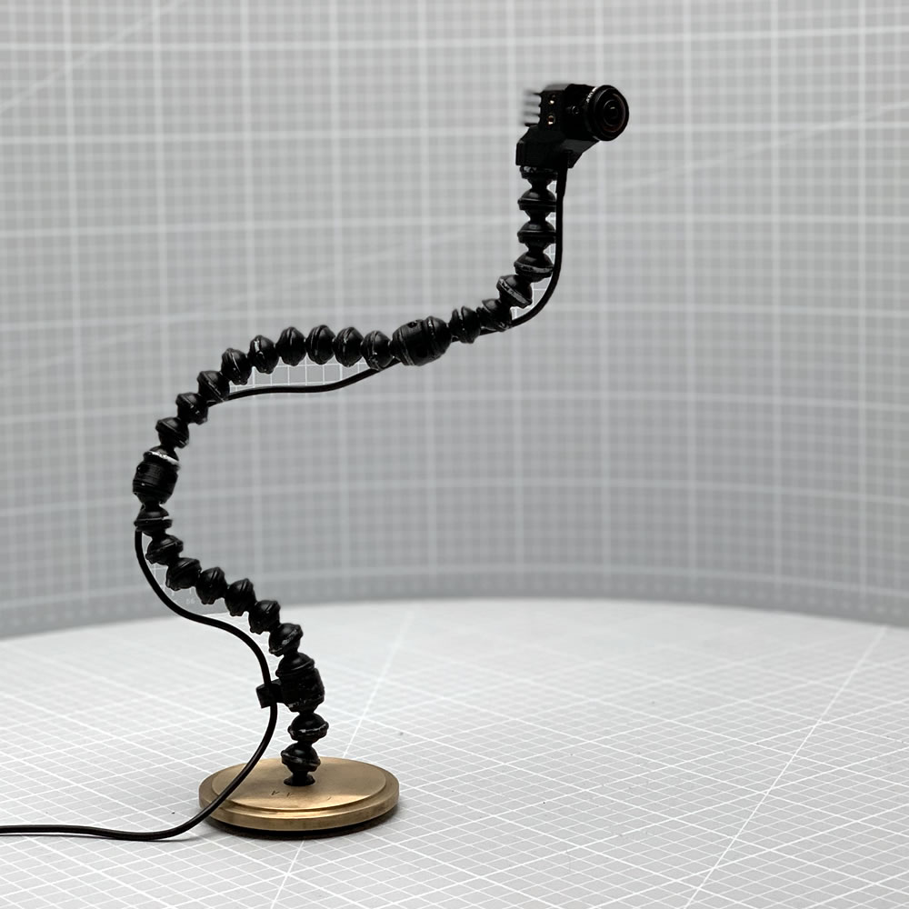 Another approach for a table based camera setup with a bendable neck but more designed to look straight (see also Cam Snake).