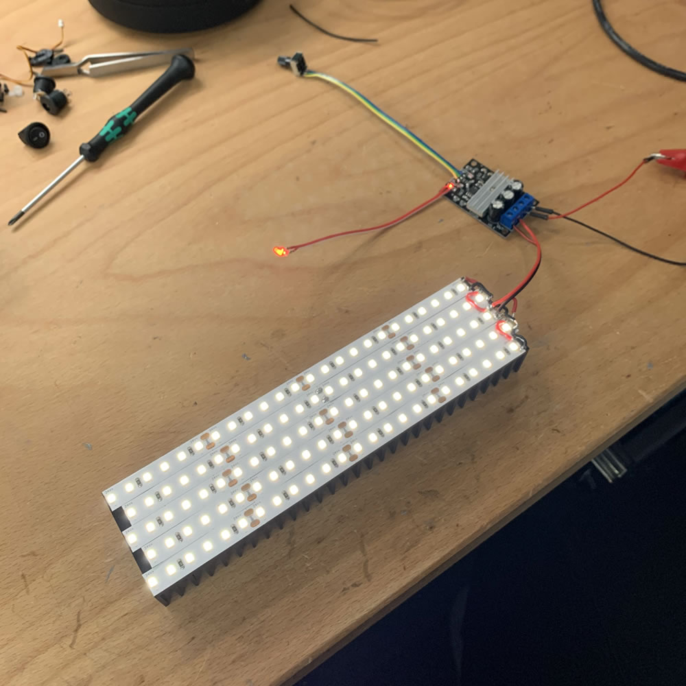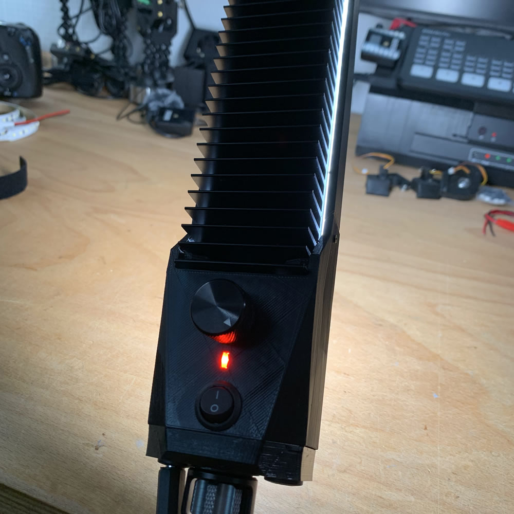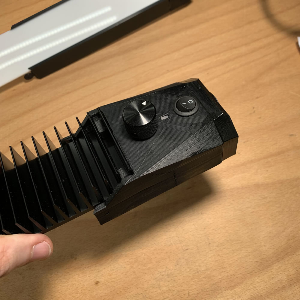 As with most models it started off with an idea I had when I found a heatsink on ebay and wondered if this could be a good part for a worklight I had in mind for quite some time. I wanted to build a light that is based on my favorite LED Strips, can be adjusted to any height and is also adjustable in brightness. Normaly lights come from a long boom from the side reaching over the whole desk. But it is very impractical when you working on small things and have a very specific demand in certain applications. I worked previously with some magic arms I found quite useful. I wanted a light attached to such a magic arm with my type of LED strip that I always use. The result is the one you can see above and below.