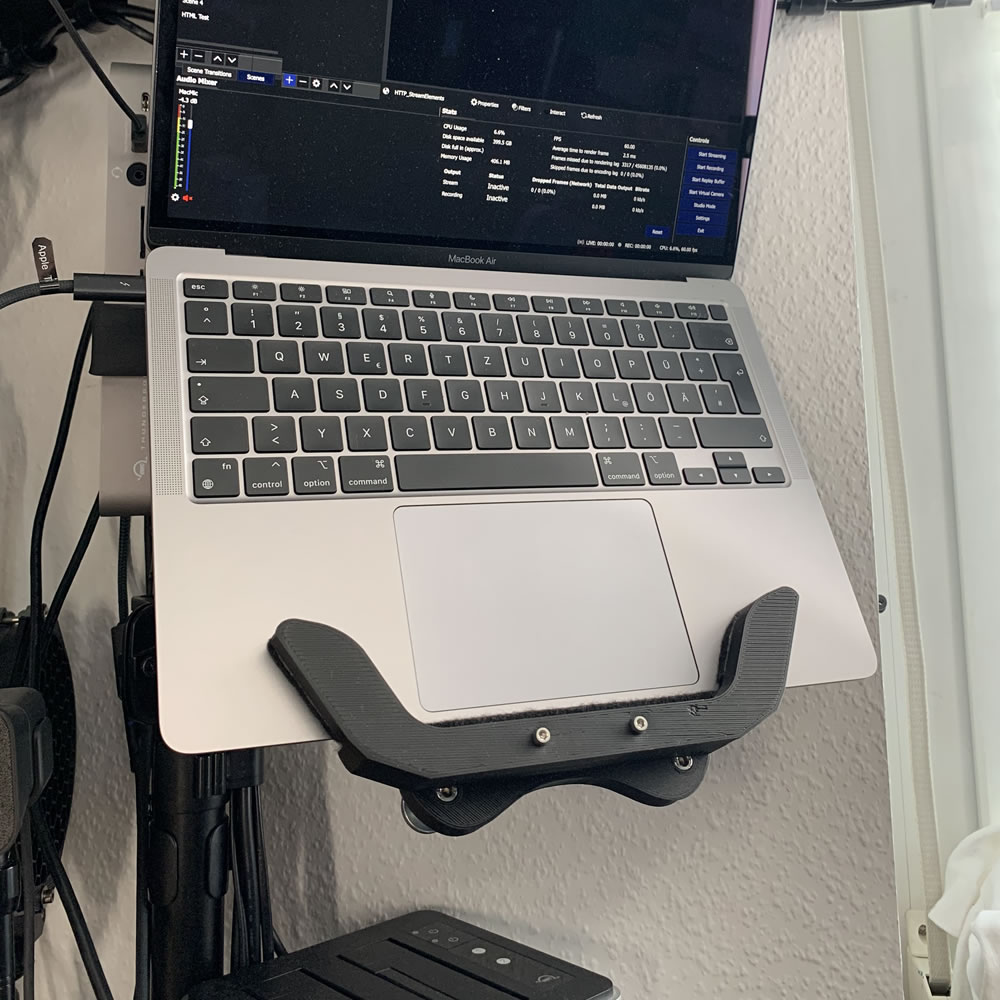 Based on the VESA Plate I designed, this small part is able to hold a Notebook in place without scratching its surface or risk of unwanted dismount. You need just two screws and a bit of felt and have a great way to mount your macbook or any other laptop.