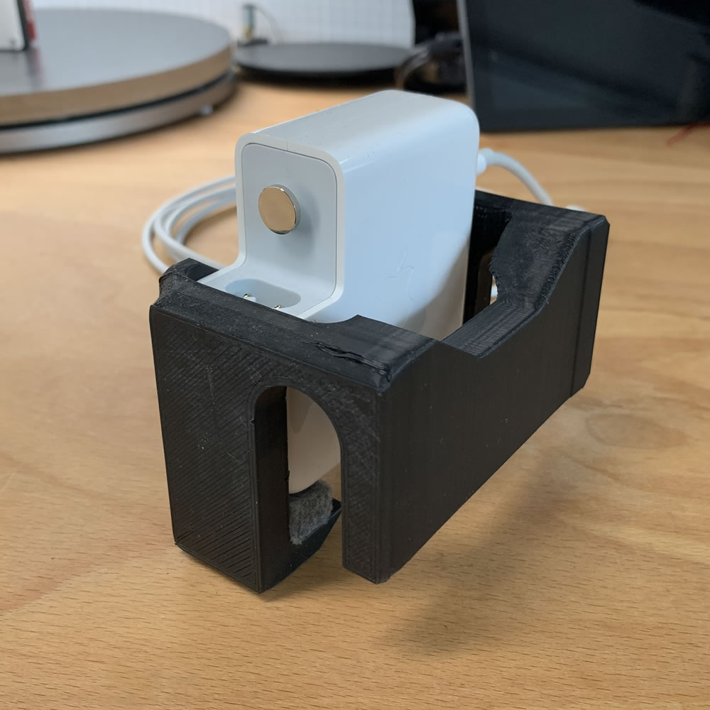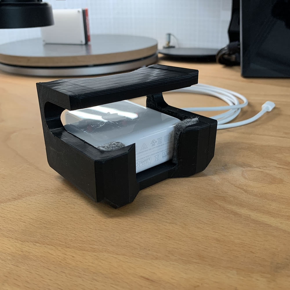 Put it on the floor? On the table? My answer is: Attach it to the Metal arm of your rigging so it can be easy mounted and dismounted and also using the metal arm as a giant heatsink for the PSU to spread the heat. Small but functional print for your Apple PSU.